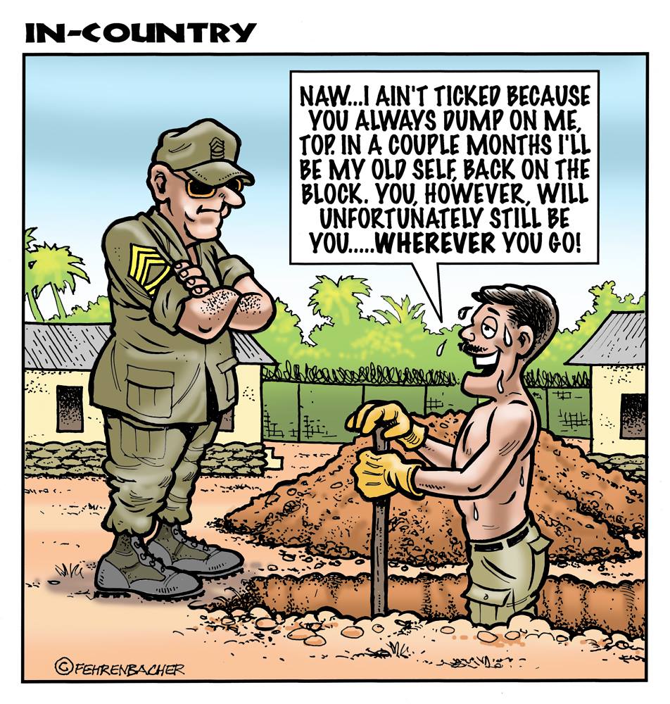 Phil enlisted in the Army in 1965 where he served for years in Vietnam.  He became a graphic designer and has worked for the state of Oregon for 26 years.  He retired in 2003 and started the Cartoon "In-Country".  The cartoons reflect his experiences during his tour of duty in South Vietnam.