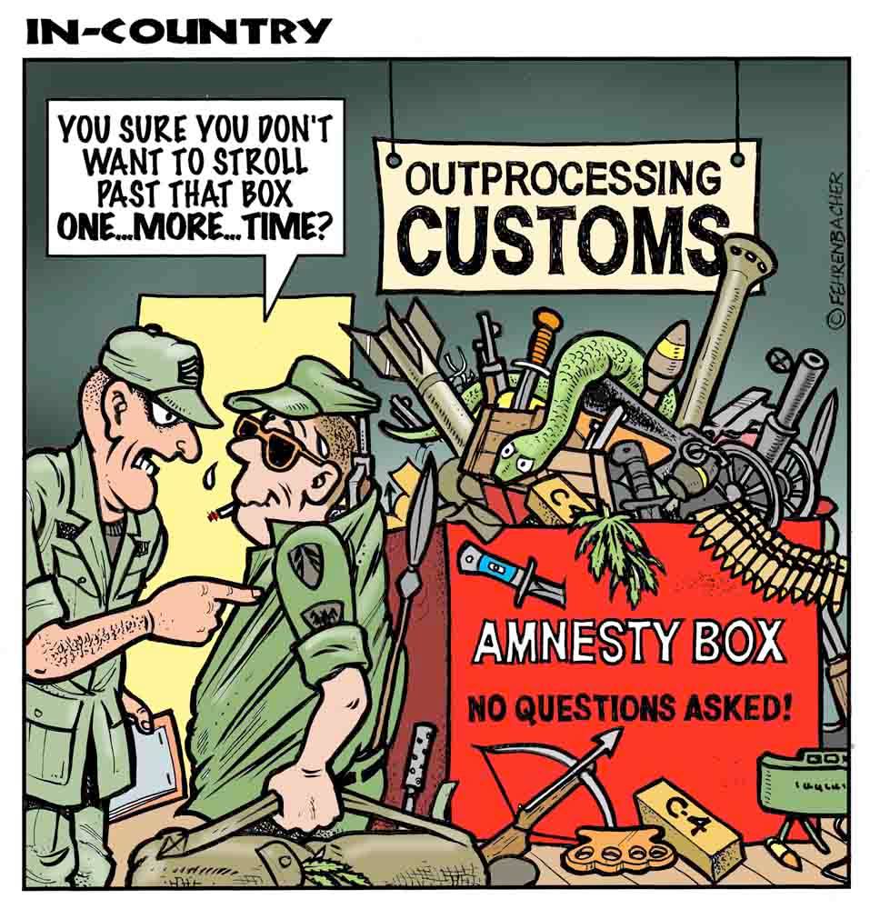 Phil enlisted in the Army in 1965 where you served for years in Vietnam.  He became a graphic designer and has worked for the state of Oregon for 26 years.  He retired in 2003 and started the Cartoon "In-Country".  The cartoons reflect his experiences during his tour of duty in South Vietnam.
