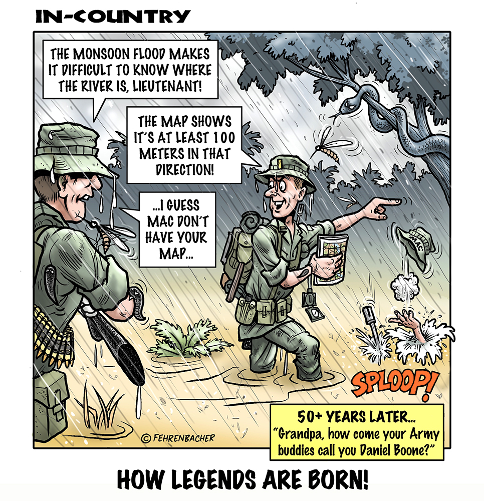 Phil enlisted in the Army in 1965 where he served for years in Vietnam.  He became a graphic designer and has worked for the state of Oregon for 26 years.  He retired in 2003 and started the Cartoon "In-Country".  The cartoons reflect his experiences during his tour of duty in South Vietnam.
